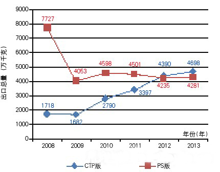 多年以前,PS版的出口量一直很高。根據(jù)海關(guān)數(shù)據(jù)統(tǒng)計,在2008年一度達(dá)到7727萬千克左右,但自2008年以后,PS版的出口量一路下滑,到2013年則達(dá)到近年來的最低點(diǎn),為4281萬千克,比2008年下降了44.6%。而CTP版的出口量雖然受2009年金融危機(jī)影響有所反復(fù),但整體趨勢一路上升,從2008年的1718萬千克,達(dá)到2013年的4698萬千克,比2008年上升幅度達(dá)173%。圖3為2008~2013年CTP版和PS版出口量對比情況(參照海關(guān)統(tǒng)計數(shù)據(jù),CTP版和PS版的統(tǒng)計范圍均為“任一邊>255mm”)。