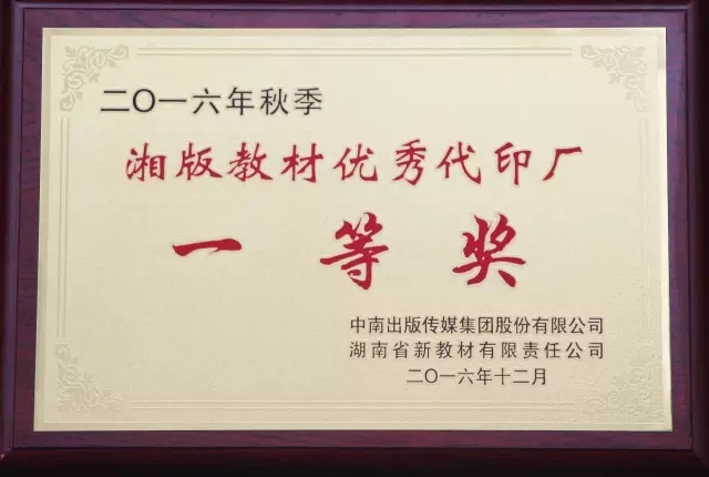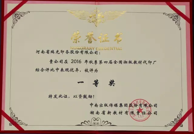 近日,由中南出版?zhèn)髅郊瘓F(tuán)股份有限公司、湖南省新教材有限責(zé)任公司組織的2016年秋季第四屆全國湘版教材優(yōu)秀代印廠綜合評(píng)比中,河南省瑞光印務(wù)股份有限公司榮獲全國湘版教材優(yōu)秀代印廠一等獎(jiǎng)。今后瑞光印務(wù)將繼續(xù)在印裝質(zhì)量、交貨周期以及綜合服務(wù)上再接再厲,保持先進(jìn)。